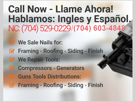 Latin Tools Sales, Parts & Repairs in Charlotte and Salisbury NC - USA, has been offering services for more than 15 years. We have extensive experience in sales and repairs within Charlotte, Salisbury and the surrounding areas in the entire North Carolina, offering a great, friendly inventory of products such as nails and guns for framing, roofing, siding, and finishing. We make it possible for residential and commercial projects—including houses, apartments, offices, and buildings—to be constructed in a faster, cheaper, and more secure way.